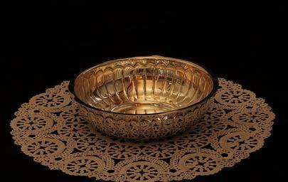 Keywords: bowl metal silver candy dish doily reflection