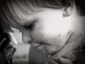 Keywords: boy muddy dirty playing eating ice cream black and white face