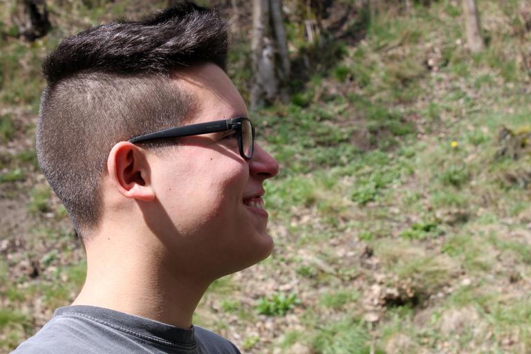 Keywords: boy profile young people man teenager human male glasses nature grass portrait young teen laugh smile happy friendly funny