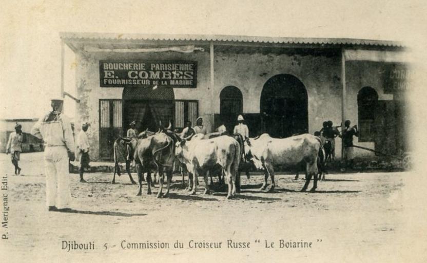 Keywords: Boyarine Djibouti 1902.jpg en Cattle intended for slaughter at a Djibouti butcher shop in 1902 The meat was destined to the Russian cruiser Boyarin at anchor at Djibouti for coaling and taking in supplies The Boyarin was sunk early in 1904 during the Russo-Japanese War Local Djibouti postcard issued in 1902-1903 1902 Delcampe net online auctions P Merignac Éditeur PD-old-70-1923 Uploaded with UploadWizard Buildings in Djibouti Butcher's shops Boyarin ship 1901 Postcards of Djibouti |