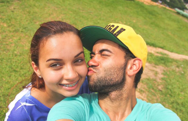 Keywords: boyfriends love casal kiss young brasilian smile girl brackets cap