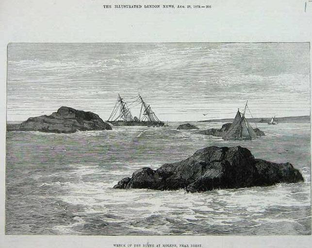 | Keywords: Boyne 1875.jpg Illustrated London News engraving of the shipwreck of the packet boat Boyne foundering off the Ponant Islands Brittany in 1875 fr Naufrage du paquebot Boyne au large des iles Molène près de Brest 1875 http //www wrecksite eu/wreck aspx 135680 Author PD-old 1875 engravings 1875 in Bretagne Archipel de Molène Historical images of Finistère Illustrated London News ships Royal Mail Steam Packet Company Ships built in 1871 Shipwrecks in art | ||||