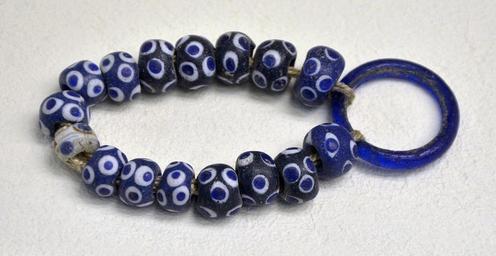 Keywords: Bracelet verre 5ème siècle - JC Musée Saint-Remi 130208.jpg Bracelet avec 16 perles ocellées en pâte de verre et un anneau en verre Provient de la nécropole des Vins de Bruyère près de Prosnes Marne ; période de la Tène ancienne 5ème siècle - JC Tombe M 33 / B 123 fouilles de Maurice Bry et de Marie-Louise Morgen entre 1928 et 1937 Actuellement exposé au Musée Saint-Remi à Reims Own 10/02/08 Vassil Glass beads and beadwork bracelets Beaded bracelets La Tène culture artefacts Ancient glassware Salle archéologie Musée Saint-Remi Celtic jewellery Prosnes 5th-century BC glassware |