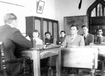 | Keywords: argentina bible school bibleschool classroom blackandwhite monochrome black and white Caption: John Koppenhaver is teaching a class in the Bible School in Bragado, Argentina. There are three German students and three Argentine students. Citation: Mennonite Board of Missions. Photographs. Argentina, 1942-1963. IV-10-7.2 Box 1 folder 35, photo #4. Mennonite Church USA Archives - Goshen. Goshen, Indiana Caption: John Koppenhaver is teaching a class in the Bible School in Bragado, Argentina. There are three German students and three Argentine students. Citation: Mennonite Board of Missions. Photographs. Argentina, 1942-1963. IV-10-7.2 Box 1 folder 35, photo #4. Mennonite Church USA Archives - Goshen. Goshen, Indiana |