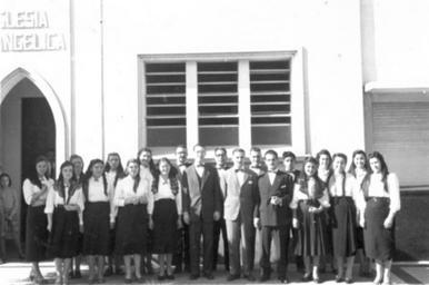 | Keywords: argentina chorus bragado blackandwhite monochrome black and white Caption: Bragado Bible School Chorus in front of Arrecifes Church where they gave a program October 1956. In the center is director, Delbert Erb. Citation: Mennonite Board of Missions. Photographs. Argentina, 1942-1963. IV-10-7.2 Box 1 folder 35, photo #17. Mennonite Church USA Archives - Goshen. Goshen, Indiana. Caption: Bragado Bible School Chorus in front of Arrecifes Church where they gave a program October 1956. In the center is director, Delbert Erb. Citation: Mennonite Board of Missions. Photographs. Argentina, 1942-1963. IV-10-7.2 Box 1 folder 35, photo #17. Mennonite Church USA Archives - Goshen. Goshen, Indiana. |
