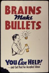 | Keywords: Brains Make Bullets. You Can Help^ - NARA - 534246.tif Scope and content General notes 534246 Local identifier 179-WP-397 Office for Emergency Management War Production Board 01/1942 - 11/03/1945 Still Picture Records Section Special Media Archives Services Division NWCS-S National Archives at College Park 8601 Adelphi Road College Park MD 20740-6001 other date circa 1942 1943 Record group Record Group 179 Records of the War Production Board 1918 - 1947 Record group ARC 508 War Production Board compiled 1942 - 1943 Series ARC 533858 File unit File unit ARC Variant control numbers NAIL Control Number NWDNS-179-WP-397 yes Other versions <gallery> File Brains_Make_Bullets _You_Can_Help _-_NARA_-_534246 tif tif File Brains_Make_Bullets _You_Can_Help _-_NARA_-_534246 jpg jpg </gallery> NARA-cooperation PD-USGov World War II posters from the United States NARA TIF images with categorized JPGs |