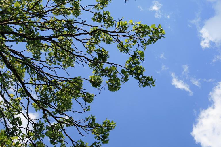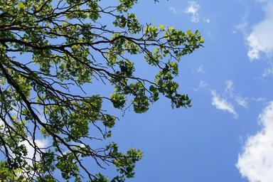 Keywords: branches trees foliage leaves clumped green sky blue clouds white