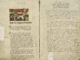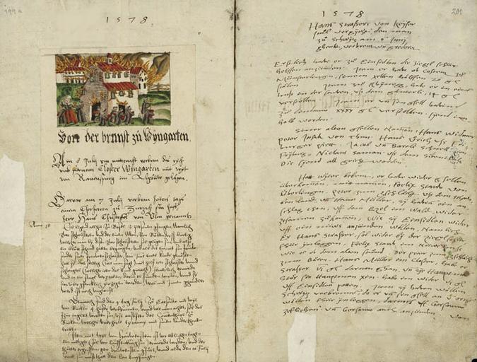 | Keywords: Brand Weingarten 1578.jpg  Brand des Klosters Weingarten am 8 Juli 1578; kolorierte Federzeichnung ; Bild 6 3 x 9 8 cm Johann Jakob Wick Sammlung von Nachrichten zur Zeitgeschichte aus den Jahren 1560-87 mit älteren Stücken Handschrift aus der Benediktinerabtei St Martin Weingarten; Zentralbibliothek Zürich Handschriftenabteilung Ms F 27 Bl 199v; Identifier INVNR Ms_F_27_f199v_f200r; http //opac nebis ch/F func direct local_base NEBIS doc_number 005335995 1578 Creator Unknown PD-old-100 Kloster Weingarten History of Weingarten Württemberg 1578 in Germany Historic fires in Germany Wickiana |