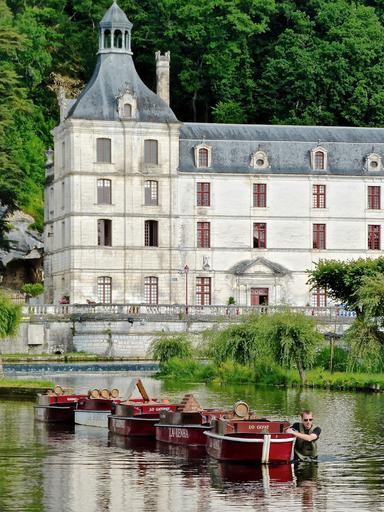 Keywords: brantome dronhe river marouatte chateau weir reflection tranquil france calm water boats