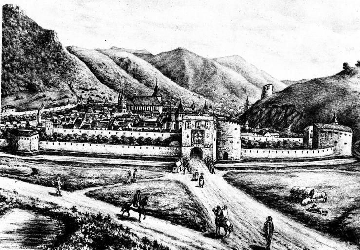Keywords: Brasov 1689.jpg Stampă a Braşovului dinaintea incendiului din 1689 Pe rândul din faţă de la stânga la dreapta Bastionul Aurarilor Poarta Vămii în dreptul ei în fundal Poarta Ecaterinei Bastionul Curelarilor Pe dealul din dreapta Turnul Negru cel subţire şi Turnul Alb În fudal pe centru Casa Sfatului şi Biserica Sf Maria Neagră după incendiul din acelaşi an În stânga pe linia zidului Bastionul Funarilor Frânghierilor două turnuri de pulbere Bastionul Ţesătorilor de la care porneşte un zid înspre Tâmpa cu Turnul Cuţitarilor Imagine fără drept de autor >70 ani BV-II-a-A-11294 XVIIth century engraving 1689 PD-old-100 Old engravings of Brașov 1689 Fortifications in Brașov |