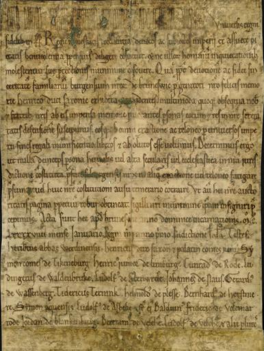 Keywords: Braunschweig Zollprivileg 1199 Otto IV A I 1 Nr. 1 (Stadtarchiv Braunschweig).jpg Braunschweig Germany Customs privilege of Holy Roman Emperor Otto IV bestowed upon the citizens of Braunschweig in 1199 Braunschweig Zollprivileg Ottos IV für die Bürger Braunschweigs aus dem Jahre 1199 Institution Stadtarchiv Braunschweig unbekannt / unknown 1199 Das Original der Abbildung befindet sich im Stadtarchiv Braunschweig http //www braunschweig de/kultur_tourismus/bibliotheken_archive/stadtarchiv/index html <br /> Wenn Sie diese Abbildung verwenden möchten informieren Sie uns bitte per E-Mail an mailto stadtarchiv braunschweig de <br /> The original can be found at the Stadtarchiv Braunschweig Braunschweig City Archives cf http //www braunschweig de/kultur_tourismus/bibliotheken_archive/stadtarchiv/index html <br /> If you intend to use this picture please notify us via email mailto stadtarchiv braunschweig de Collections of Stadtarchiv Braunschweig Documents of Braunschweig PD-old-100 |