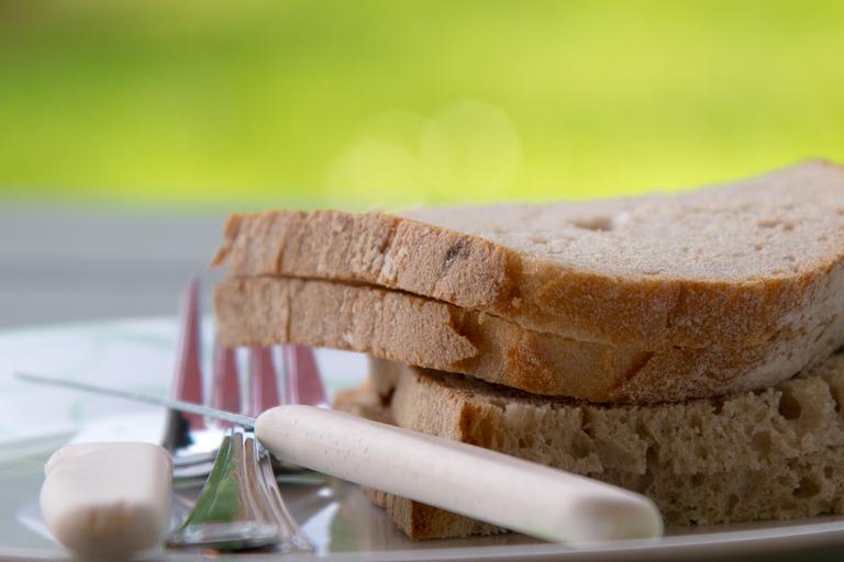 Keywords: bread knife fork eat breakfast snack hunger cutlery garden vespers frisch crispy homemade substantial food plate bauernbrote bread slices breakfast plate abendbrot