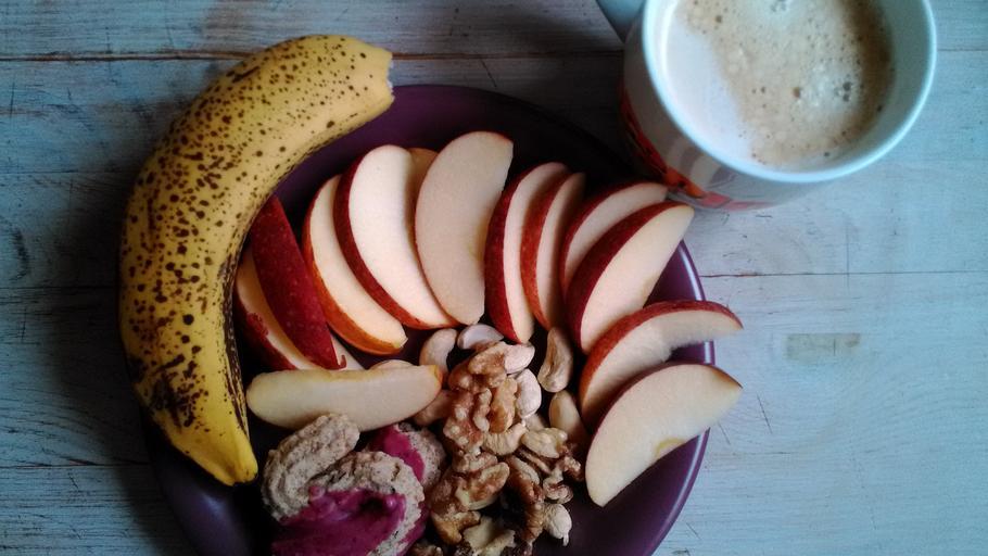 Keywords: breakfast banana apple plate healthy cup food fruits have breakfast nuts