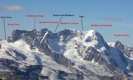 Keywords: Breithorn con indicazioni.jpg Breithorn Monte Breithorn dal versante nord svizzero con l'indicazione delle varie vette e colli own Francofranco56 2010-09 Breithorn