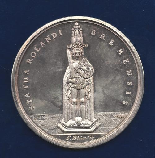 Keywords: Bremen Peace Medal 1648 by Blum, obverse.jpeg en Medallion d 56 mm 48 69 g Ag 1 000 Fine Silver Commemorating the Peace of Westphalia after the Thirty Years' War Curved above the Bremen Roland STATUA ROLANDI BREMENSIS / City view with a bridge over the river Weser with ships Above 2 flying angels holding the shields of the emperor l and of the Free City of Bremen r and dividing 2 lines BREMA 1648 Curved above CONSERVA DOMINE HOSPITIUM ECCLESIÆ TUÆ Forrer I p 201 According to legend Bremen will remain free and independent for as long as Roland stands watch over the city For this reason it is alleged that a second Roland statue is kept hidden by the State of Bremen in the town hall's underground vaults which can be quickly installed as a substitute should the original fall Today Bremen is one of the 16 States of the Federal Republic of Germany Medallist J Johann Blum about 1599 Bremen - after 1689 Condition PROOF 1648-01-31 own Berlin-George other versions cc-by-sa-4 0 PD-old-100 This photo PD-1923 1648 medals Medals of Germany Category Bremen Peace of Westphalia Silver medals Scanned with HP OfficeJet 6600 |