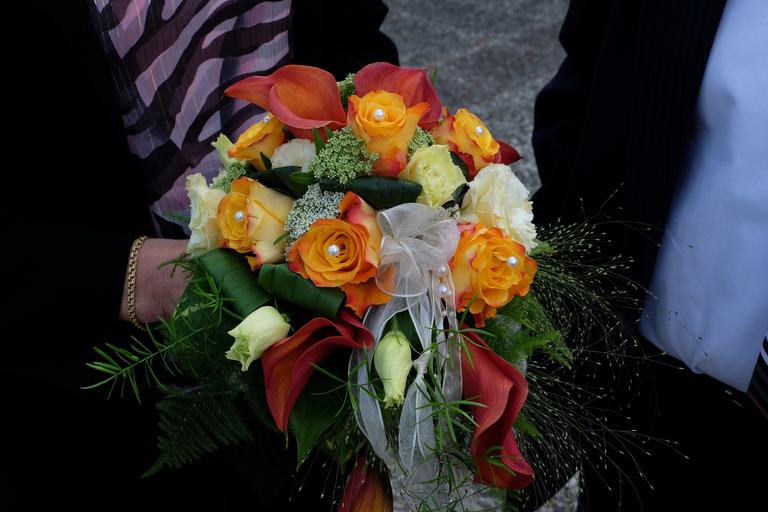 Keywords: bridal bouquet flowers wedding romantic strauss congratulations symbolism tradition summer red yellow symbol roses rose bloom marriage