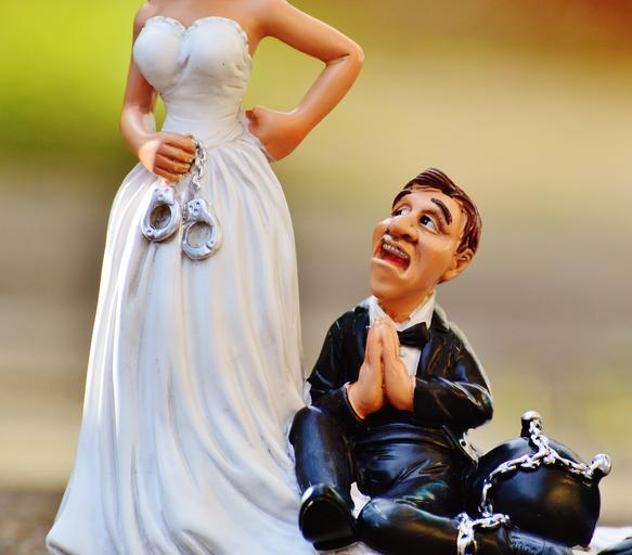 Keywords: bride and groom handcuffs anklet marry wedding marriage groom bride suppression connectedness spouses before decoration married to force fig love together connection grind down the aisle funny fun panic