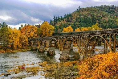 Keywords: bridge fall river leaves autumn fall trees yellow orange oregon