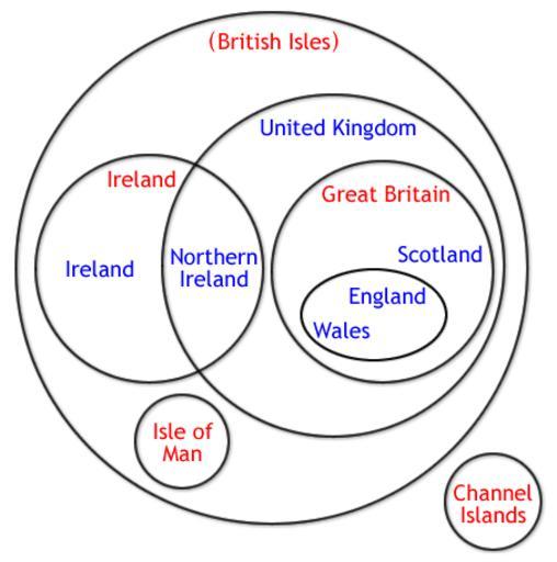 | Keywords: British Isles Venn Diagram-en (2).png British Isles Venn Diagram-de svg Update of British_Isles_Venn_Diagram jpg<br> Added Isle of Man Original by User Jfg284 Geographical locations are shown in red political entities are in blue Other versions SVG commons File British Isles Venn Diagram-de svg en wikipedia Liftarn CommonsHelper 2006-03-06 Seabhcan wikipedia en Main Seabhcan Original upload log page en wikipedia British_Isles_Venn_Diagram png 2006-07-15 21 06 AnonMoos 453×457× 28980 bytes <nowiki>parenthesize British Isles misc minor tweaking </nowiki> 2006-05-30 23 01 AnonMoos 453×457× 28845 bytes <nowiki>centering smaller circles within largest circle</nowiki> 2006-05-30 06 47 AnonMoos 453×457× 28804 bytes <nowiki>changing circle to ellipse and repositioning some captions for clarity; also centering diagram and better PNG compression</nowiki> 2006-05-23 01 12 Whcodered 453×457× 170394 bytes <nowiki>Whoops- fixed my mistake</nowiki> 2006-05-21 18 21 Blisco 453×457× 14499 bytes <nowiki>Reverted to earlier revision</nowiki> 2006-05-16 01 24 Whcodered 453×457× 167865 bytes <nowiki>Updated British_Isles_Venn_Diagram png file - new look</nowiki> 2006-05-10 10 30 AnonMoos 453×457× 14499 bytes <nowiki>trimming margins compressing add ellipse around England and Wales</nowiki> 2006-03-09 16 26 EricR 468×648× 41181 bytes <nowiki>Reverted to earlier revision</nowiki> 2006-03-09 09 10 Robdurbar 468×648× 40723 bytes <nowiki>Modified to show ambiguous position of channel islands re Talk British Isles terminonolgy </nowiki> 2006-03-06 13 00 Seabhcan 468×648× 41181 bytes <nowiki>Update of British_Isles_Venn_Diagram jpg Added Isle of Mann Original by User Jfg284</nowiki> Subdivisions of the United Kingdom Membership diagrams |