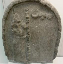 Keywords: British Museum Stela of Nabonidus.JPG en Basalt stela of Nabonidus BabelStone own Museum British Museum credit line 2010-06-24 Details Basalt stela rounded at the top and bearing on its obverse the figure of a king and astronomical symbols the star of Ishtar-Venus the winged disc of the sun god Shamash and the crescent of the moon god Sin; the latter is the largest showing supremity sculptured in relief within a sunk panel The king wears a conical headdress and a fringed garment which reaches to the ankles In his right hand which is raised he holds a short cylindrical object and with his left hand he supports a ringed staff or standard with its end resting on the ground The standard has nine or ten rings or bands around the lower part of the shaft and six rings round the upper part; the central part of the shaft where it would be grasped by the hand is without rings The symbol it supported is now broken but its outline resembles a small crescent The symbols are carved in the upper field of the panel; the blank space below at one time bore an inscription but it has been rubbed down and the surface prepared for a new record A portion of the text which was engraved on the right-hand side of the stele has only been partially rubbed down and the characters may still be deciphered It is an inscription of a Babylonian king and recounts how the gods put an end to a period of drought in consequence of the king's good deeds To indicate the extraordinary prosperity of his country after the return of the rain the king gives details with regard to the prices at which grain dates sesame-seed wool and wine changed hands In each case the amount is stated which could be bought for a shekel of silver The edge of the reverse is chamfered off The lines of the inscription on the right-hand side extend from the edge of the obverse to the edge of the reverse across this chamfered face Height 58 cm in on Width 46 cm in on Thickness 25 cm in on Room 55 cc-zero Nabonidus Archaeological star glyphs Star of Shamash Room 55 British Museum |