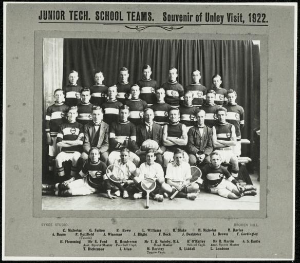 | Keywords: archives state records nsw staterecordsnsw newsouthwales blackandwhite sport school broken hill brokenhill photo border black and white Title: Broken Hill Public School - Junior Technical School Teams. Souvenir of Unley visit, 1922 Dated: year only 31/12/1922 Digital ID: 15051_a047_001858 Rights: No known copyright restrictions www.records.nsw.gov.au/about-us/rights-and-permissions We'd love to hear from you if you use our photos/documents. Many other photos in our collection are available to view and browse on our website using Photo Investigator. Title: Broken Hill Public School - Junior Technical School Teams. Souvenir of Unley visit, 1922 Dated: year only 31/12/1922 Digital ID: 15051_a047_001858 Rights: No known copyright restrictions www.records.nsw.gov.au/about-us/rights-and-permissions We'd love to hear from you if you use our photos/documents. Many other photos in our collection are available to view and browse on our website using Photo Investigator. |