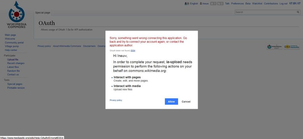 Keywords: Broken OAuth activation on the commons.jpg en Broken OAuth activation on the commons 2016-03-20 own Ineuw other versions cc-zero Screenshots of Wikipedia bugs OAuth