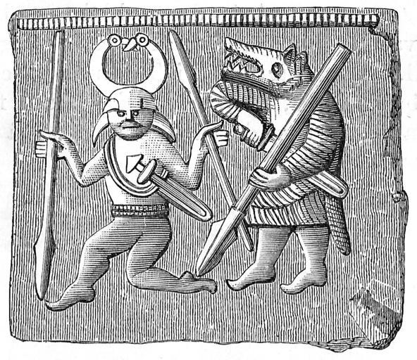 Keywords: Bronsplåt pressbleck öland vendeltid.jpg Vendel era bronze plate Place of discovery Öland Sweden Depicted are a berserker on the right and Oden on the left also noted looks like a berserk hunter about to decapitate his enemy Oden's famous characters markers are non-existent in that carving Bronsplåt med upphöjda bilder för pressning av tunt bronsbleck vendeltid Fyndplats Öland Eventuellt föreställer figuren till höger en bärsärk eller ulvhedin figuren till vänster Oden Umzeichnung eines Bronze-Pressbleches der Vendelzeit Fundplatz Öland Schweden Oscar Montelius Om lifvet i Sverige under hednatiden Stockholm 1905 s 98 before 1905 author PD 150px Woodcut in higher resolution 6 9 Mpx 150px Old photo of the original helmet plate patrix 0 4 Mpx 150px Photo of replika 1 1 Mpx PD-old-70-1923 Bird-horned helmets Om lifvet i Sverige under hednatiden 1905 Torslunda helmet plate patrices Woodcuts of Sweden Horned masks Humans with fictional creatures 20th-century woodcuts