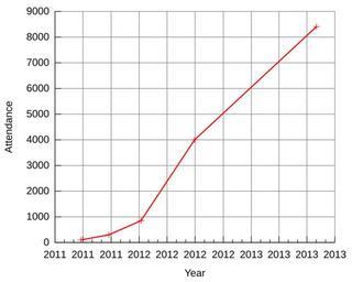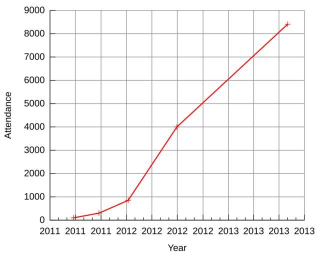 Keywords: BronyCon-Attendance.svg alert me and I'll be happy to update this graph The file cmd contained the following set terminal svg fname Arial fsize 14 set ylabel Attendance set xlabel Year set datafile missing 'NA' unset key set grid back lw 1 set border 3 set ytics nomirror set xtics nomirror set xdata time set timefmt Y- m- d set format x Y plot \ data csv using 1 2 with linespoints lw 2 The file data csv contained Dates are the start date Dates and attendance are as reported in the English Wikipedia article BronyCon Date Attend 2011-06-25 100 2011-09-24 300 2012-01-07 850 2012-06-30 4000 2013-08-02 8407 The output was created with the command gnuplot < cmd > out svg 2012-06-28 own Alan De Smet I Alan De Smet disclaim any copyright on this image It is a mechanical creation by gnuplot with negligible creative input The data itself cannot be copyrighted cc-zero Uploaded with UploadWizard BronyCon |