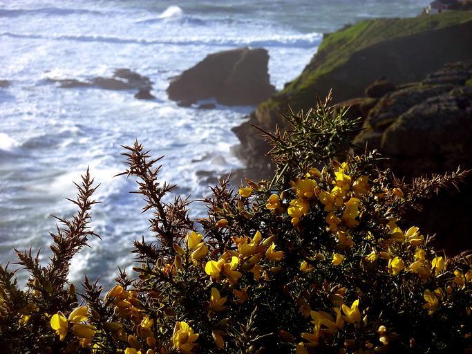 Keywords: broom coast cliff cornwall sea water bluff steep slope spray surf