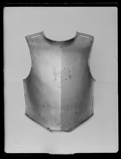 Keywords: Bröstharnesk, karolinsk typ 1600-talets slut - Livrustkammaren - 70764.tif LSH artwork sv Av stål drivet i ett stycke utsidan blankpolerad och insidan brunsvart av korrosion med tydliga slagmärken <br/>Rak och stram form Tämligen framåtsluttande axlar B 86 mm Svag mittås med början ca 45 mm under halskragen ner till nedre kant Under halskragen inslagen stämpel möjligen IVP inom fyrkant Rundade urtagningar för hals och armar kanterna omvikta utåt och rundsmidda Nedre kant likaså med i mitten urtagning L 70 mm Halskanten utsmidd till en krage H i mitten 20 mm På höger axel inslaget 2 <br/>Rektangulära hål L 44-46 mm vid axlar och nertill i sidorna Parvis satta hål runt armurtag och längs nedre kant På insidan strax innanför vänster armurtag inslagen stämpel i form av en krona På högra sidan inslaget 17 Svagt synligt skottprov på höger nedre brösthalva diam ca 10 mm original caption end other date century 17 steel g 7252 size mm 140 340 440 LRK place of origin original filename LN_E01544 59061 inventory number LRK 22499 70764 CC0 Bröstharnesk karolinsk typ 1600-talets slut - Livrustkammaren - 70764-negative tif Breastplates Media contributed by LSH 2015-11 |