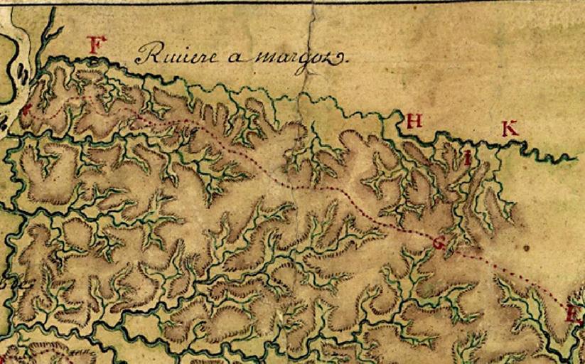 Keywords: BroutinMargotCloseup.jpeg The watershed of the Riviere a Margot now called Wolf River in 1740 Everything above the red dotted line a Chickasaw trail is part of the Wolf River Detail from the map Carte particulière d'une partie de la Louisianne ou les fleuve et rivierres onts etés relevé a l'estime les routtes par terre relevé mesurées aux pas par les Srs Broutin de Vergés ingénieurs Saucier dessinateur Drawn by a cartographer who only signed the name Demarigny the map concentrates on the surveys of Broutin Vergés and Saucier in Mississippi and Alabama Demarigny was probably Antoine Phillipe Sieur de Marigny Chevalier de St Louis 1722-1779 a New Orleans-based geographer and explorer Whether or not the composite map was drawn by Antoine Phillipe this specific map detail is based on surveys by his step-father Ignace François Broutin Capitaine Ingénieur du Roi chief engineer of the Louisiana colony during the Chickasaw Campaign of 1739-40 Broutin accompanied Jean-Baptiste Le Moyne Sieur de Bienville governor of Louisiana up the Mississippi River on this military expedition and was charged with building fortifications Forte d e l'Assumption on the Fourth Chickasaw Bluff at the mouth of the Margot River and finding a way to move heavy siege weapons from Fort Assumption to Ackia the Chickasaw stronghold near present-day Pontotoc Mississippi A cannon-less Bienville suffered a bloody defeat at Ackia in 1736 Existing trails proved unsuitable for heavy wagons so Broutin explored a water-route via the Margot now the Wolf River after a small group of young Iroquois mercenaries reported for duty at Ft Assumption via the Margot claiming that one of the river's branches extended to within 8 leagues of the Chickasaw villages Broutin's party of French grenadiers and African slaves attempted the survey during the Wolf River Watershed's low water season February and encountered too many fallen trees snagging the channel Before spring rains could raise the water level Bienville secured a peace settlement with the Chickasaw and returned to New Orleans The other watersheds depicted on this map detail moving north to south include Nonconnah Creek and the intricate Coldwater River system A branch of the Little Tallahatchie is seen at the lower right corner although it is identified by Broutin as the Riviere des Yasoax Yazoo The Little Tallahatchie does however flow into the Yazoo much further south Library of Congress the original chart was purchased during personal visit to the foreign markets by Philip Lee Phillips Chief Division of Maps and Charts ca 1905-06 Full map viewable at http //memory loc gov/cgi-bin/query/h ammem/gmd field NUMBER+ band g4010+ct000681 1743 Demarigny probably Antoine Phillipe de Marigny and Ignace François Broutin Caption information sources Environmental Protection Agency Office of Wetlands Oceans and Watersheds http //cfpub epa gov/surf/state cfm statepostal MS Surf Your Watershed site Journal of the Chickasa War by an unidentified French officer 1739-1740 published in http //books google com/books vid OCLC29101939 id G1vBKrAoEnAC pg PR25 lpg PR25 22 PPA82 M1 Mississippi as a Province Territory and State John Claiborne 1880 pp 82-83 Basis for identifying the cartographer Demarigny http //books google com/books vid 0AUIesHPTUgYPun1yTrQS_b id cXQOAAAAIAAJ pg PA13 Creole Families of New Orleans Grace King 1922 pp 13-16 http //books google com/books vid 0ZSXnwAo5DsxDU9FT4 id pV9PHeqWEOUC pg PA44 Report of the Librarian of Congress 1906 pp 43-44 The http //www wolfriver org Wolf River Conservancy Maps of rivers of the United States Wolf River Tennessee Old maps of the United States Wolf River Tennessee Jean-Baptiste Le Moyne de Bienville Chickasaw PD-old-100 |