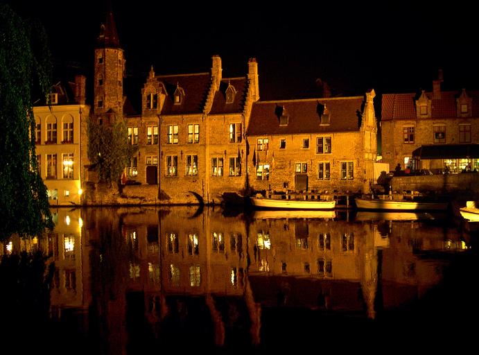 Keywords: bruges belgium old town mirroring night reflection medieval city dark lights