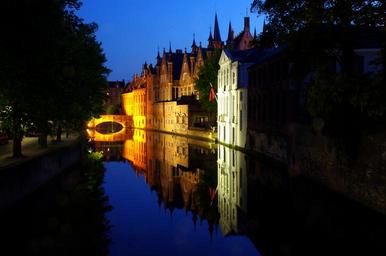Keywords: bruges night mirroring water reflection abendstimmung lights water reflection night photograph reflections channel