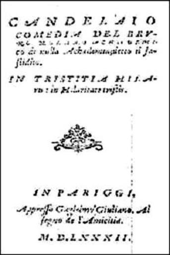 Keywords: Bruno Candelaio.jpg it frontespizio Candelaio di Giordano Bruno Parigi 1582 web scanner PD-old Philosophy books book covers single pages etc Books by Giordano Bruno