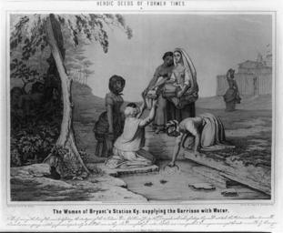 | Keywords: Bryant's station.jpg Depiction of the women of Bryan Station getting water while Native Americans who are about to besiege the settlement watch Famous event in Kentucky during the American Revolutionary War http //lcweb2 loc gov/cgi-bin/query/r pp/PPALL field DOCID+ lit 2003656964 Library of Congress 1851 Print by Nagel Weingartner PD-art American Revolution History of Kentucky Illustrations of Native Americans | ||||