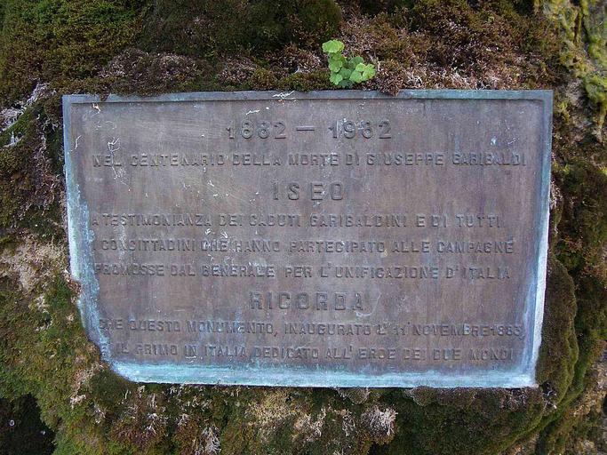 Keywords: BS-Iseo-006-centenario-morte-Garibaldi.jpg it Iseo BS targa commemorativa del primo centenario della morte di Giuseppe Garibaldi apposta alla base del suo monumento own Albertomos 2009 nessuna <center> 1882 “ 1982 NEL CENTENARIO DELLA MORTE DI GIUSEPPE GARIBALDI ISEO A TESTIMONIANZA DEI CADUTI GARIBALDINI E DI TUTTI I CONCITTADINI CHE HANNO PARTECIPATO ALLE CAMPAGNE PROMOSSE DAL GENERALE PER L ™UNIFICAZIONE D ™ITALIA RICORDA CHE QUESTO MONUMENTO INAUGURATO L ™11 NOVEMBRE 1883 E' IL PRIMO IN ITALIA DEDICATO ALL ™EROE DEI DUE MONDI </center> ImageNote 1 157 241 1312 785 1632 1224 2 <center> 1882 “ 1982 NEL CENTENARIO DELLA MORTE DI GIUSEPPE GARIBALDI ISEO A TESTIMONIANZA DEI CADUTI GARIBALDINI E DI TUTTI I CONCITTADINI CHE HANNO PARTECIPATO ALLE CAMPAGNE PROMOSSE DAL GENERALE PER L ™UNIFICAZIONE D ™ITALIA RICORDA CHE QUESTO MONUMENTO INAUGURATO L ™11 NOVEMBRE 1883 E' IL PRIMO IN ITALIA DEDICATO ALL ™EROE DEI DUE MONDI </center> ImageNoteEnd 1 Plaques in Iseo Monument to Giuseppe Garibaldi Iseo Plaques referencing 1882 Plaques to Giuseppe Garibaldi Plaques installed in 1982 |