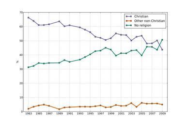Keywords: Bsa-religion-question.svg en Time series of responses to British Social Attitudes question Do you regard yourself as belonging to any particular religion IF YES Which IF 'Christian' PROBE FOR DENOMINATION Results for all non-Christian religions have been combined Data Year 1983 1984 1985 1986 1987 1989 1990 1991 1993 1994 1995 1996 1997 1998 1999 2000 2001 2002 2003 2004 2005 2006 2007 2008 2009 Christian 66 31 63 97 61 08 61 11 61 57 63 68 60 22 60 92 59 42 57 8 56 05 52 8 52 05 50 54 51 77 55 18 54 18 53 99 50 14 52 79 53 55 48 05 48 16 50 16 43 70 Other non-Christian 1 99 3 41 4 32 4 93 4 08 1 7 2 93 3 13 3 48 3 48 3 39 3 79 4 39 2 98 3 23 4 66 4 00 4 17 5 99 3 33 6 19 5 60 5 70 5 70 5 00 No religion 31 28 32 2 34 29 33 95 34 32 34 41 36 34 35 08 36 68 38 49 40 38 42 66 43 02 45 06 43 75 39 5 41 22 41 11 43 04 43 4 39 63 45 77 45 67 43 64 50 70 Ref/NA 0 35 0 45 0 31 0 03 0 09 0 17 0 5 0 78 0 43 0 2 0 18 0 79 0 52 1 36 1 2 0 59 0 66 0 72 0 82 0 49 0 6 0 64 0 57 0 5 0 50 Created by myself using data from the British Social Attitudes Survey http //www britsocat com/BodySecure aspx control BritsocatMarginals var RELIGION SurveyID 221 Created with Matplotlib Made using matplotlib with this python program <source lang python > /usr/bin/env python - - coding utf-8 - - Time series of responses to British Social Attitudes question Do you regard yourself as belonging to any particular religion IF YES Which IF 'Christian' PROBE FOR DENOMINATION Results for all non-Christian religions have been combined Source http //www britsocat com/BodySecure aspx control BritsocatMarginals var RELIGION SurveyID 221 from pylab import rc 'font' family 'sans-serif' rc 'figure' figsize 12 8 t 1983 1984 1985 1986 1987 1989 1990 1991 1993 1994 1995 1996 1997 1998 1999 2000 2001 2002 2003 2004 2005 2006 2007 2008 2009 seriesChristian 66 31 63 97 61 08 61 11 61 57 63 68 60 22 60 92 59 42 57 8 56 05 52 8 52 05 50 54 51 77 55 18 54 18 53 99 50 14 52 79 53 55 48 05 48 16 50 16 43 7 seriesOther 1 99 3 41 4 32 4 93 4 08 1 7 2 93 3 13 3 48 3 48 3 39 3 79 4 39 2 98 3 23 4 66 4 00 4 17 5 99 3 33 6 19 5 60 5 70 5 70 5 00 seriesNone 31 28 32 2 34 29 33 95 34 32 34 41 36 34 35 08 36 68 38 49 40 38 42 66 43 02 45 06 43 75 39 5 41 22 41 11 43 04 43 4 39 63 45 77 45 67 43 64 50 7 seriesNA 0 35 0 45 0 31 0 03 0 09 0 17 0 5 0 78 0 43 0 2 0 18 0 79 0 52 1 36 1 2 0 59 0 66 0 72 0 82 0 49 0 6 0 64 0 57 0 5 0 5 red-green colourblind friendly plot t seriesChristian 's-' lw 3 color ' 7570b3' plot t seriesOther 's-' lw 3 color ' d95f02' plot t seriesNone 's-' lw 3 color ' 1b9377' ylabel ' ' axis 1982 2009 0 70 xticks arange 1983 2009 2 legend 'Christian' 'Other non-Christian' 'No religion' 'upper right' grid True savefig 'bsa-religion-question svg' </source> Transferred from http //en wikipedia org en wikipedia; transfer was stated to be made by User Smurfy 2009-06-22 Original uploader was Duncan Keith at http //en wikipedia org en wikipedia Later version s were uploaded by Urpunkt at http //en wikipedia org en wikipedia Released into the public domain by the author en wikipedia Duncan Keith Original upload log en wikipedia Bsa-religion-question svg 2011-02-13 04 35 Urpunkt 1080×720× 70565 bytes <nowiki>Updated with 2009 data published this January</nowiki> 2010-08-15 10 42 Duncan Keith 1080×720× 68563 bytes <nowiki>Update with 2008 data </nowiki> 2009-06-22 16 02 Duncan Keith 1080×720× 53849 bytes <nowiki>Time series of responses to British Social Attitudes question Do you regard yourself as belonging to any particular religion IF YES Which IF 'Christian' PROBE FOR DENOMINATION Results for all non-Christian religions have been combined Data </nowiki> Cc-zero Religion in the United Kingdom Atheism Demography Images with Python source code |