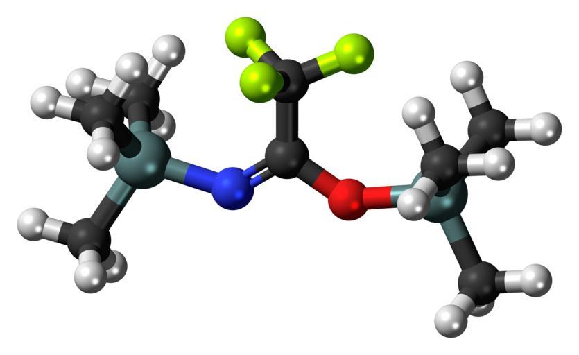 Keywords: BSTFA-3D-balls.png Ball-and-stick model of the N O-Bis trimethylsilyl trifluoroacetamide molecule also known as BSTFA a compound used in analytical chemistry Colour code 505050 Carbon C black<br> F0F0F0 Hydrogen H white<br> F51E1E Oxygen O red<br> 3C50FA Nitrogen N blue<br> C8FA00 Yellow-green Fluorine F<br> 78A0A0 Silicon Si blue-grey<br> 2011-06-08 own DS Visualizer Jynto talk Space-filling version cc-zero Trimethylsilyl compounds Silicon-nitrogen compounds Silicon-oxygen compounds Trifluoromethyl compounds Images by Jynto Ball-and-stick models |