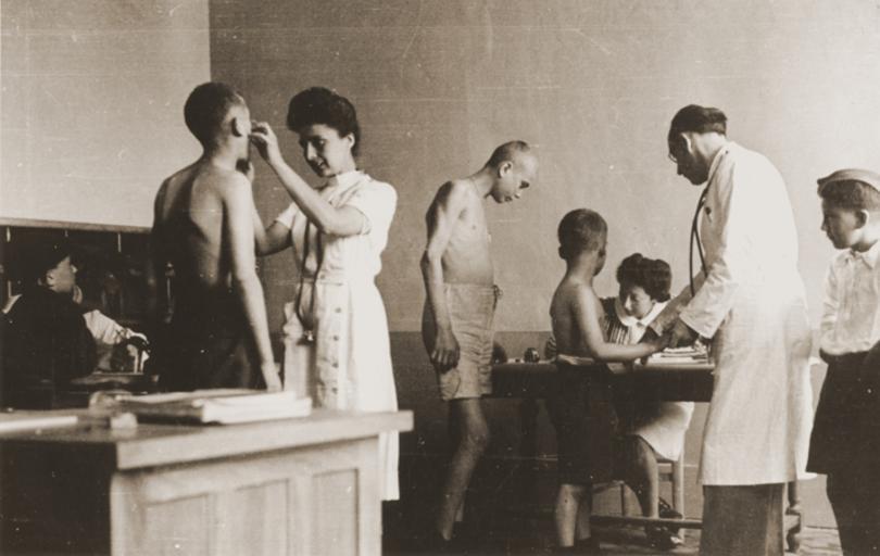 Keywords: Buchenwald Children 26145.jpg Children liberated at Buchenwald are examined by medical personnel Pictured on the far right is Salek Finkelstein The medical doctor on the left is Françoise Brauner 1911-2000 The Buchenwald children were a group of approximately 1000 Jewish child survivors found by American troops when they liberated the Buchenwald concentration camp on April 11 1945 Most of the children were originally from Poland though others came from Hungary Slovenia and Ruthenia Unsure of what to do with the child survivors American army chaplains Rabbi Herschel Schacter and Rabbi Robert Marcus contacted the offices of the OSE Oeuvre de Secours aux Enfants Jewish children's relief organization in Geneva They arranged to send 427 of the children to France 280 to Switzerland and 250 to England Vivette Samuels reverses the figures for England and Switzerland in her monograph Sauver les Enfants On June 2 1945 OSE representatives arrived in Buchenwald and together with Rabbi Marcus escorted the transport of children to France Rabbi Schacter accompanied the second transport to Switzerland Because of the difficulty in finding clothing for the children the boys were clad in Hitler Youth uniforms This created a problem for when the train crossed into France it was greeted by an angry populace who assumed the train was carrying Nazi youth Thereafter the words KZ Buchenwald orphans were painted on the outside of the train to avoid confusion On June 6 1945 the French transport arrived at the Andelys station and the orphans were taken to a children's home in Ecouis Eure The home had been set up to accommodate young children but in fact only 30 of the boys were below the age of 13 This was only one of the many problems faced by the OSE personnel who were not prepared to handle a large group of demanding rebellious teenagers who were full of anger for what they had experienced At Ecouis the boys were given medical care counseling and schooling until more permanent accommodations could be found Most of the children remained only four to eight weeks at Ecouis before being moved elsewhere and the home was closed in August 1945 Among the first to leave were a group of 173 children who had family in Palestine They were given immigration certificates and departed from Marseilles in July aboard the British vessel the RMS Mataroa The remaining boys at Ecouis were soon transferred to other residences and homes Some of the older ones were sent to the Foyer d'Etudiants located on the rue Rollin in Paris where they boarded while attending vocational training courses or working at jobs in the city Others were sent to the Chateau de Boucicaut home in Fontenay-aux-Roses Hauts-de-Seine Many of the boys came from religiously observant homes Since the OSE could not obtain kosher food for everyone they divided the children into religious and non-religious groups Dr Charly Merzbach offered OSE the use of his estate the Chateau d'Ambloy Loir-et-Cher for the summer and between 90 and 100 boys chose to go there in order to receive kosher food and live in a religious environment In October 1945 the children and staff of Ambloy were relocated to the Chateau de Vaucelles in Taverny Val d'Oise About 50 of the non-religious boys were taken to the Villa Concordiale in Le Vesinet Yvelines near Paris that housed an equal number of French Jewish orphans In the summer they went to the Foyer de Champigny in Champigny-sur-Marne Val-de-Marne In all the homes attended by the Buchenwald children vocational training as well as regular classroom instruction was offered At the same time OSE social workers made every effort to locate surviving relatives succeeding in about half the cases By the end of 1948 all of the Buchenwald children who had come to France had left the OSE fold and begun new lives for themselves Sources Hemmendinger Judith and Krell Robert The Children of Buchenwald Gefen Publishers 2000; Grobman Alex Rekindling the Flame Wayne State University Press 1993; Hazan Katy Chronologie de l'histoire de l'OSE L'action de l'OSE apres la guerre 31 December 2002 Buchenwald Thuringia Germany April 1945 - June 1945 http //www ushmm org/ United States Holocaust Memorial Museum courtesy of Robert Waisman PD-USGov Buchenwald_children Images from the United States Holocaust Memorial Museum |