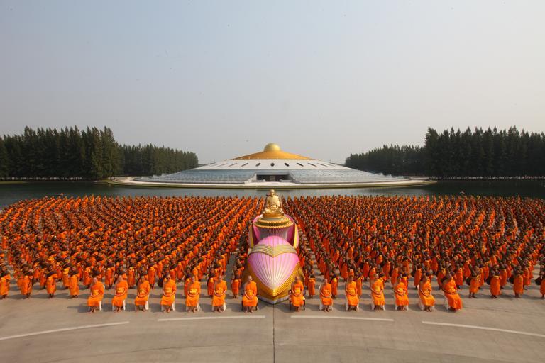 Keywords: buddhists monks buddhism orange robes thai thailand ceremony convention gathering people praying prayer group many wat phra dhammakaya temple dhammakaya pagoda more than million budhas gold