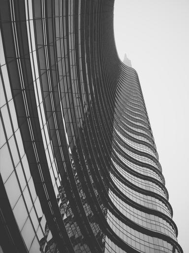 Keywords: building perspective skyscaper tower architecture urban windows corporate black and white exterior geometric futuristic structure