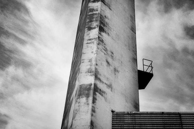 Keywords: building wall tower architecture black and white balcony railing sky clouds