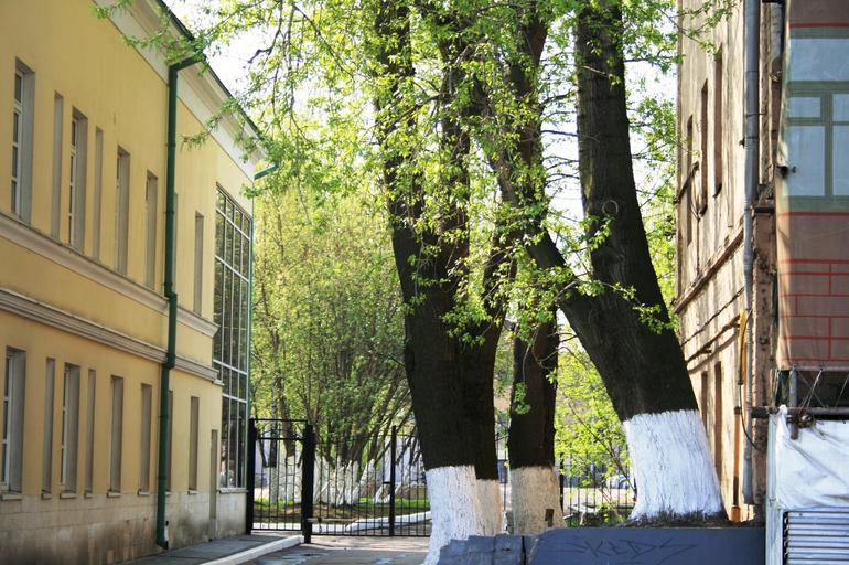 Keywords: buildings cream and pink trees tree trunks green leaves spring