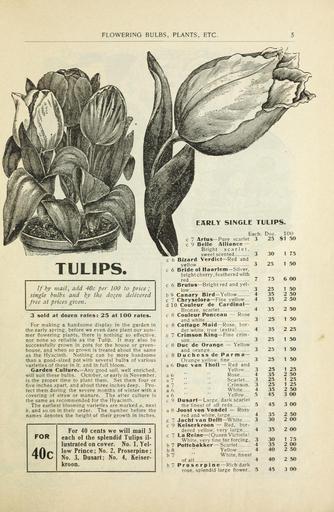 Keywords: Bulbs and plants (16202134999).jpg FLOWERING BULBS PLANTS ETC <br> TULIPS <br> Doz <br> 25 <br> 100 <br> 1 50 <br> 30 <br> 1 75 <br> 25 <br> 1 50 <br> If by mail add 40c per 100 to price ; <br> single bulbs and by the do en delivered <br> free at prices given <br> 75 6 00 <br> 3 sold at dozen rates 25 at 100 rates <br> For making a handsome display in the garden in <br> the early spring - before we even dare plant our sum- <br> mer flowering- plants there is nothing so effective <br> nor none so reliable as the Tulip It may also be <br> successfully erown in pots for the house or green- <br> house and when so grown is treated about the same <br> as the Hyacinth Nothing can be more handsome <br> than a good-sized pot with several bulbs of various <br> varieties of these in it and in full bloom <br> Garden Culture Any good soil well enriched <br> will suit these bulbs October or early in November <br> is the proper time to plant them Set them four or <br> five inches apart and about three inches deep Pro- <br> tect them during the severe months of winter with a <br> covering of straw or manure The after culture is <br> the same as recommended for the Hyacinth <br> The earliest blooming varieties are marked a next <br> b and so on in their order The number before the <br> names denotes the height of their growth in inches <br> For 40 cents we will mail 3 <br> each of the splendid Tulips il <br> lustrated on cover No 1 Yel- <br> low Prince; No 2 Proserpine; <br> No 3 Dusart; No 4 Keiser- <br> kroon <br> ESRLY SINGLE TULIPS <br> Each <br> c 7 Artus Pure scarlet 3 <br> c 9 Belle Alliance <br> Bright scarlet <br> sweet scented 3 <br> c 6 Bizard Verdict Red and <br> yellow 3 <br> c 6 Bride of Haarlem Silver <br> bright cherry feathered with <br> red 7 <br> c 6 Brutus Bright red and yel- <br> low 3 <br> b 9 Canary Bird Yellow 4 <br> c 7 Chryselora Fine yellow 4 <br> d 10 Couleur de Cardinal- <br> Bronze scarlet 4 <br> c 8 Couleur Ponceau Rose <br> and white 3 <br> c 8 Cottage Maid Rose bor- <br> der white true extral 4 <br> c 7 Crimson King Fine crim- <br> son 3 <br> c 8 Due de Orange Yellow <br> and orange 3 <br> c 8 Duchess de Parm a <br> Orange yellow fine 3 <br> a b Due van Tholl Red and <br> Yellow 3 <br> a 6 Rose 4 <br> a 7 Scarlet 3 <br> a 7 Crimson 3 <br> a 6 ' White 4 <br> a 6 Yellow 5 <br> c 9 Dusart Large dark scarlet <br> the finest of all reds 5 <br> a 8 Joost von Vondel Rosy <br> red and white large 4 <br> c 7 Jacht van Delft White 3 <br> c 9 Keiserkroon Red bor- <br> dered yellow very large 4 <br> c 7 La Reine Queen Victoria' <br> White very fine for forcing 3 <br> b 7 Pottebakker Scarlet 4 <br> b8 Yellow 4 <br> b7 White finest <br> of all 4 <br> b7 Proserpine Rich dark <br> rose splendid large flower 5 <br> 25 <br> 35 <br> 35 <br> 1 50 <br> 2 50 <br> 2 50 <br> 35 <br> 2 50 <br> 25 <br> 1 50 <br> 35 <br> 2 25 <br> 25 <br> 1 50 <br> 25 <br> 1 50 <br> 25 <br> 1 50 <br> 25 <br> 35 <br> 25 <br> 25 <br> 35 <br> 45 <br> 1 25 <br> 2 50 <br> 1 25 <br> 1 25 <br> 2 50 <br> 3 00 <br> 45 <br> 3 00 <br> 35 <br> 30 <br> 2 50 <br> 2 00 <br> 35 <br> 2 00 <br> 30 <br> 35 <br> 40 <br> 1 75 <br> 2 00 <br> 2 50 <br> 40 <br> 2 50 <br> 45 <br> 3 00 42214135 133055 65937 Page 5 Text http //www biodiversitylibrary org/page/42214135 1908 10 5962/bhl title 65937 Currie Brothers Company ; Henry G Gilbert Nursery and Seed Trade Catalog Collection NameFound Brutus Biodiversity Heritage Library Currie Bros Co Bulbs and plants autumn 1901 Garden Stories Bulbs Plants Catalogs Flowers Nurseries Horticulture Plants Ornamental Seeds U S Department of Agriculture National Agricultural Library bhl page 42214135 dc identifier http //biodiversitylibrary org/page/42214135 bhlGardenStories BHLinbloom bulbs plants nurseries horticulture plants ornamental u s department of agriculture national agricultural library bhlgardenstories bhlinbloom Information field Flickr posted date ISOdate 2015-01-28 Check categories 2015 August 24 CC-BY-2 0 BioDivLibrary https //flickr com/photos/61021753 N02/16202134999 2015-08-24 07 54 19 cc-by-2 0 PD-old-70-1923 Currie Bros catalogs Photos uploaded from Flickr by Fæ using a script |