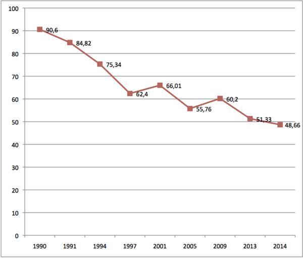 | Keywords: Bulgarian parliamentary elections turnout.png en Bulgarian parliamentary elections turnout chart bg Диаг ама на изби ателната активност на избо ите за а одно съб ание own Лъчеза 2013-05-22 Показано е изменението на изби ателната активност в на всички избо и за а одно съб ание в Бълга ия от 1990 до 2013 г Elections in Bulgaria |
