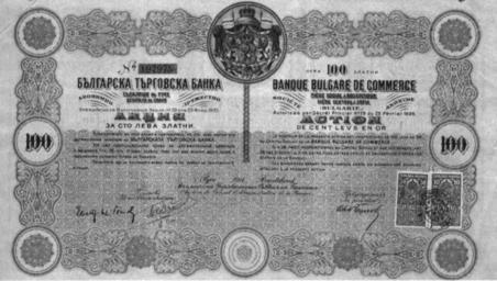 | Keywords: Bulgarska turgovska banka share.jpg Акция на Бълга ска тъ говска банка БК -БИА // Ав амов Румен Комуналният капитализъм Т II София Фондация Бълга ска наука и култу а / Центъ за либе ални ст атегии 2007 ISBN 978-954-90758-8-5 с 429 1895 Author Anonymous-EU Former banks in Rousse Stock certificates of banks in Bulgaria Revenue stamps of Bulgaria Revenue stamps on documents | ||||