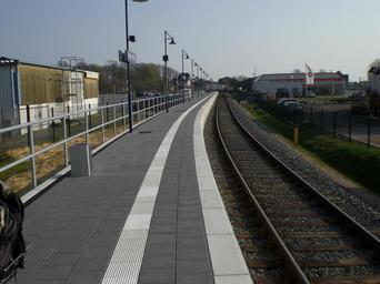 Keywords: Burg train station (Fehmarn).jpg en Burg train station platform and track on the island of Fehmarn Germany <br>In the background left of the station clock you can perceive the old station building own Bukk 2011-04-20 Cc-zero Burg auf Fehmarn Train stations in Kreis Ostholstein Burg |