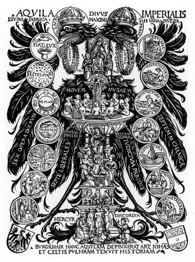 Keywords: Burgkmair Reichsadler mit Collegium poetarum.jpg Reichsadler mit Allegorien des Collegium poetarum et mathematicorum <br /> Doppeladler mit Dichterkränzen Brunnen Musenquell Hippokrene gestaltet wie ein Lebens-/Jungbrunnen 9 Musen die Philosophie mit den 7 freien Künsten unten der schlafende Paris und der sich nähernde Merkur Hubert Schrade Sinnbilder des Reiches München 1938 Abb 25 vor 1508 before 1508 Hans Burgkmair Public Domain Creator Hans Burgkmair d Ä PD-old-100 Coats of arms of the Holy Roman Empire Fountain of Youth Hans Burgkmair d Ä |