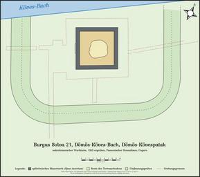 Keywords: Burgus Solva 21 – Dömös-Kövespatak.svg de Burgus Solva 21 “ Dömös-Kövespatak Der römische Wachturm wurde 1955 während einer Feldbegehung erstmals entdeckt und konnte 1959 vollständig ergraben werden Quelle Sándor Soproni žDer spätrömische Limes zwischen Esztergom und Szentendre Akadémiai Kiadó Budapest 1978 S 49 “50 Nr 19 Taf 51 1 Die dort wiedergegebene Grabungsskizze wurde mit den aus der Beschreibung bekannten Aufmaßen überarbeitet own Mediatus 2015-06-14 v Cc-zero Limes Pannonicus |