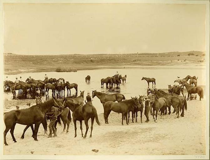 MAKE A MEME View Large Image Watering horses - Bushmen's camp. Kensington Racecourse Dated: c.1900 Digital ID: 1254_a011_a011000007r Rights: www.records.nsw.gov.au/about-us/rights-and-permissions Part of the series 'New South Wales Bushmen's Contingent's departure to ...